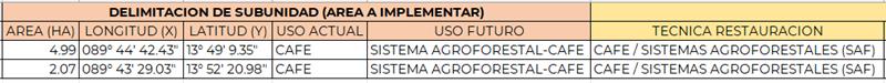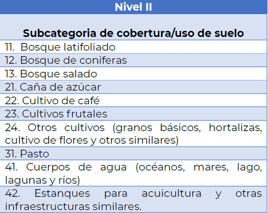 La determinación del uso actual de la subunidad de manejo se basará en el planteamiento del productor/a y la del técnico/a del proyecto. Este debe identificarse con base a la tabla del IPCC, nivel II Subcategoría de cobertura/uso del suelo que se tiene para el país, las cuales se presentan en el siguiente cuadro: