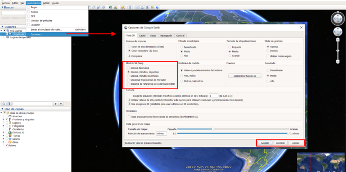 Para configurar las unidades de medida en la sección de «Herramientas», seleccionamos «Opciones», aparecerá una ventana emergente donde se podrán configurar el formato de posición (coordenadas) en grados decimales, grados – minutos – segundos, grados – minutos decimales, UTM y sistema de referencia de cuadricula militar.