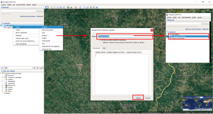 Al seleccionar Aceptar, la carpeta creada se sitúa en la sección de «Mis Lugares» y se pueden agregar o crear archivos de puntos (Marca de Posición), líneas (Rutas) y áreas (Polígonos).