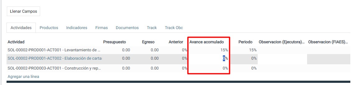 A continuación ingresaremos el porcentaje de avance de cada actividad. Para ello deberemos posicionarnos sobre la columna del avance y por cada fila de actividad iremos ingresando el porcentaje ejecutado.