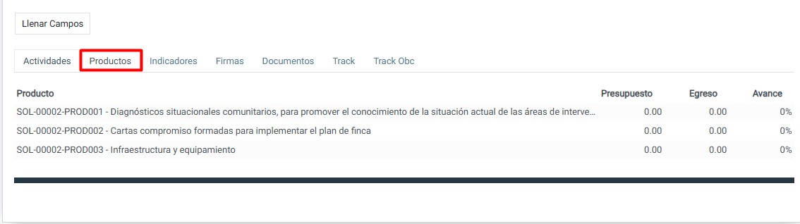Una vez ingresado el avance acumulado como se mostro en la pantalla anterior vamos a ingresar el porcentaje de los Productos que se muestra en la misma pantalla y digitaremos la información que se presenta a continuación.