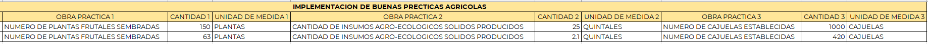 | 1 SISTEMAS AGROFORESTALES | 1.1 SIEMBRA DE ÁRBOLES FORESTALES 1.2 ESTABLECIMIENTO DE CAFÉ 1.3 ESTABLECIMIENTO DE CACAO 1.4 ESTABLECIMIENTO DE FRUTALES 1.5 CORTINAS ROMPEVIENTOS 1.6 BARRERAS VIVAS DE GRAMÍNEAS 1.7 BARRERAS VIVAS FORESTALES 1.8 ABONOS VERDES 1.9 LABRANZA MINIMA 1.1 CULTIVO EN CALLEJONES 1.11 MANEJO DE RASTROJOS 1.12 MANEJO SOMBRA 1.13 PODA DE CAFÉ 1.14 MANEJO INTEGRADO DE PLAGAS Y ENFERMEDADES 1.15 CULTIVOS EN ASOCIO 1.16 USO DE SEMILLAS NATIVAS 1.17 USO DE INSUMOS ORGÁNICOS PARA CONTROL DE PLAGAS Y ENFERMEDADES 1.18 USO DE INSUMOS ORGÁNICOS PARA LA FERTILIDAD DEL SUELO |