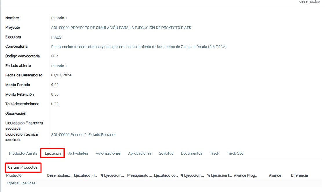 3. Seleccionar la pestaña Ejecución y seleccionar el botón Cargar productos.