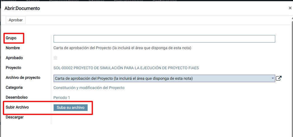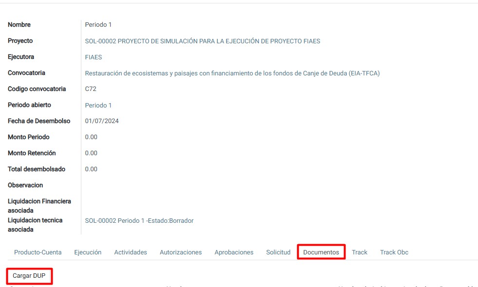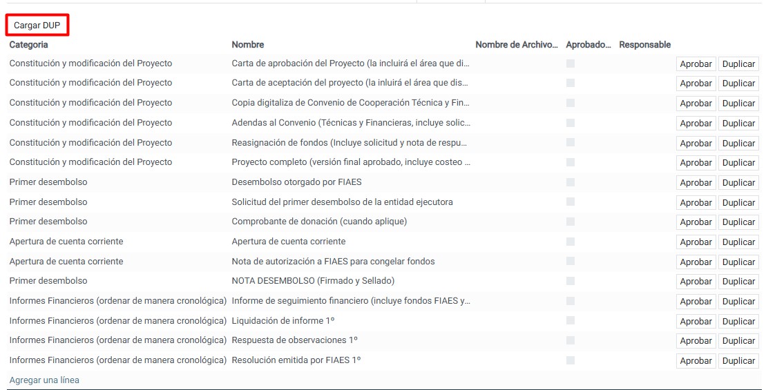 4. Cargar documentos: Seleccionar la pestaña Documentos y la pestaña Cargar DUP, el sistema le mostrara todos los documentos que sebe cargar en el sistema para poder solicitar el desembolso.