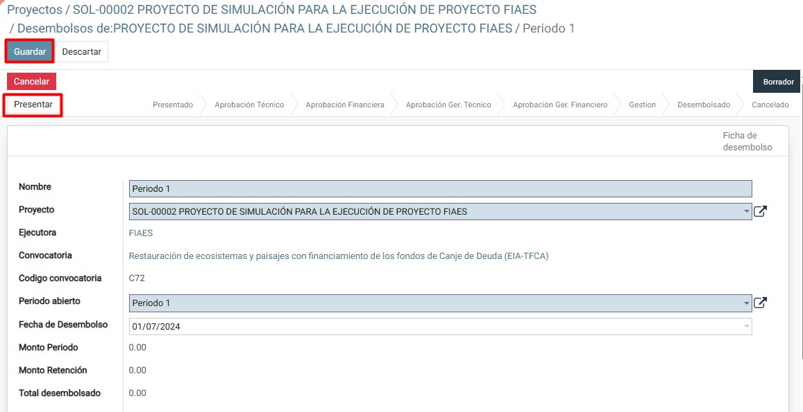 6. Seleccionar Guardar y Presentar para enviar la solicitud de desembolso para su respectiva aprobación.