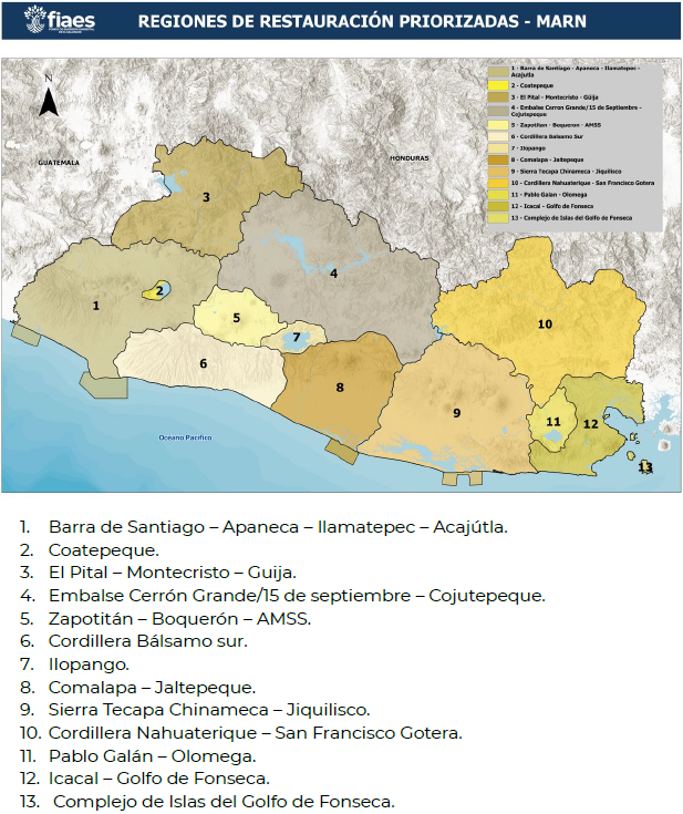 Tomar en cuenta las 13 regiones de restauración priorizadas y definidas por el Ministerio de Medio Ambiente las cuales se presentan en el siguiente mapa.