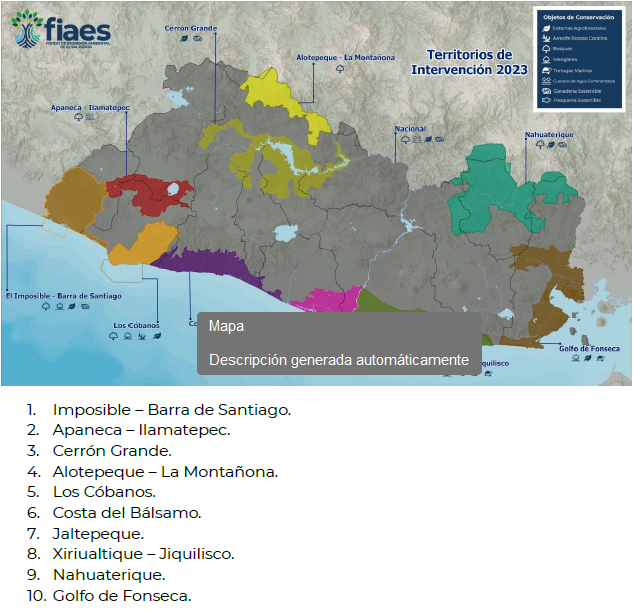 Tomar en cuenta las 10 áreas de conservación determinadas por FIAES en su Plan Estratégico Institucional 2023 – 2028 las cuales se presentan en el siguiente mapa.