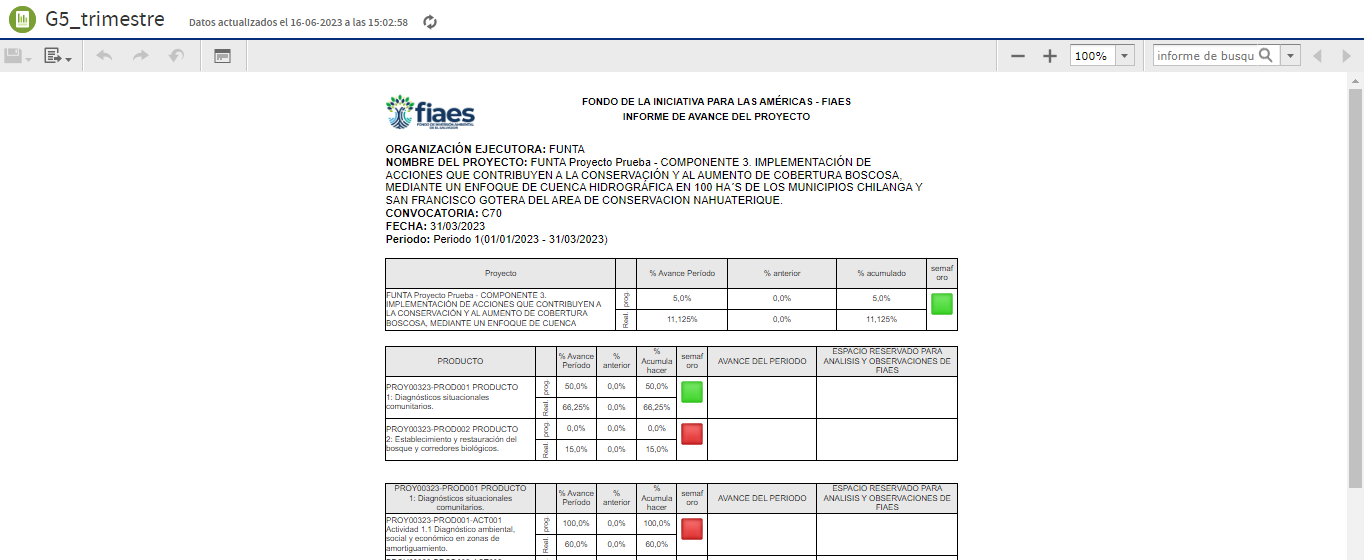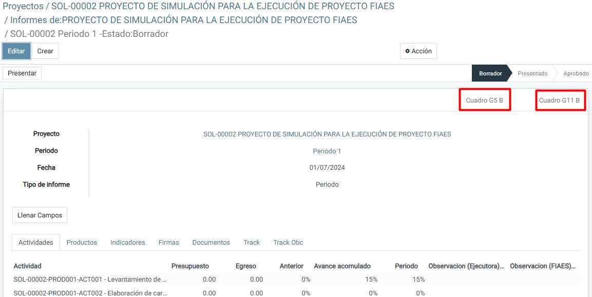 Cuadro G5 B nos presenta la ejecución del proyecto a la fecha deseada, informando el estado de los productos y actividades.